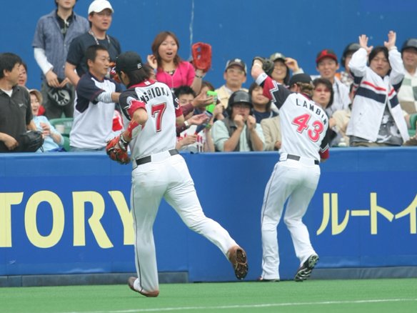 先頭・西岡の二塁打などで1死3塁と久々にチャンスを作ると、サブローが犠飛を放って、効率よく追加点を奪いました!  |