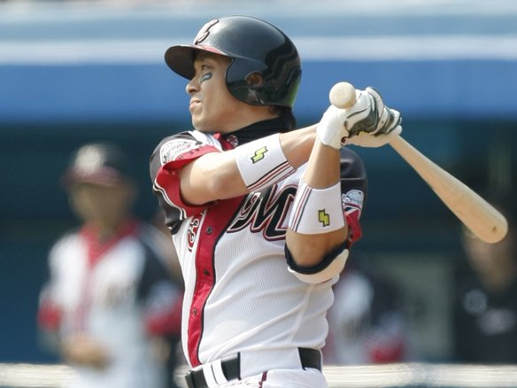 投手 小野 1番 平野恵 右翼二 1-2から内角のスライダーを弾き返した。打球はライト線を破って、打った平野は2塁到達。 |