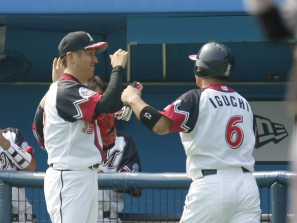 この回、今江の犠牲フライでさらに追加点を挙げました。カープ戦の勢いそのままに打線がつながりをみせ、効果的に得点を加えています!! |