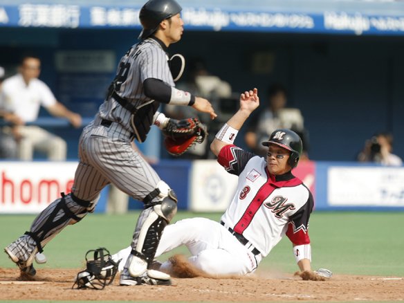 6番 里崎 四球 0-3から高めの142キロのストレートを悠然と見極め、フォアボールを選んだ。 |