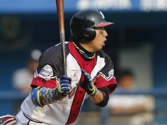 6番 ブラゼル 左翼二 1-2から内角高めのカットボールを逆方向に叩いた打球は、レフト・ベニーの左へ。打ったブラゼルは2塁へ・・・。 |