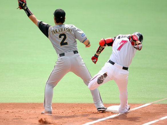 2番 小谷野 遊ゴ 2-1からアウトコース低めの変化球を引っ張り、センター前へ抜けようかという打球。しかしショート・西岡が2塁ベース寄りでさばき、そのままベースに駆け込んだ!  |