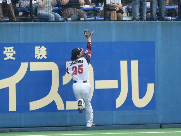 5番・スレッジの打球を見事に捕球するレフト・竹原!!