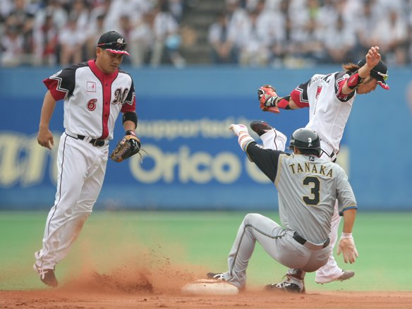 先頭・金子誠を四球で出塁させましたが、里崎の好守と小谷野を注文通りの併殺に打ち取る川崎の好リリーフで、結果的に3人で打ち取りました!良い流れのまま1番・西岡からの攻撃を迎えます!  |
