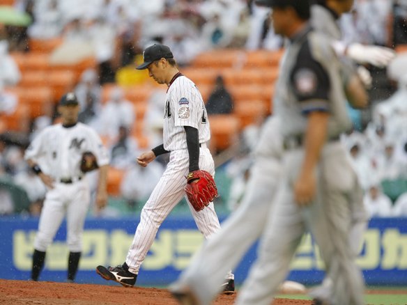 先頭・森本の不運な内野安打のあと、稲葉に10号2ランホームランを喫して同点とされました。しかし、その後は落ち着いて3人を抑え、2点にとどめました。直後の攻撃で突き放し、もう1度流れをマリーンズに引き寄せる!  |