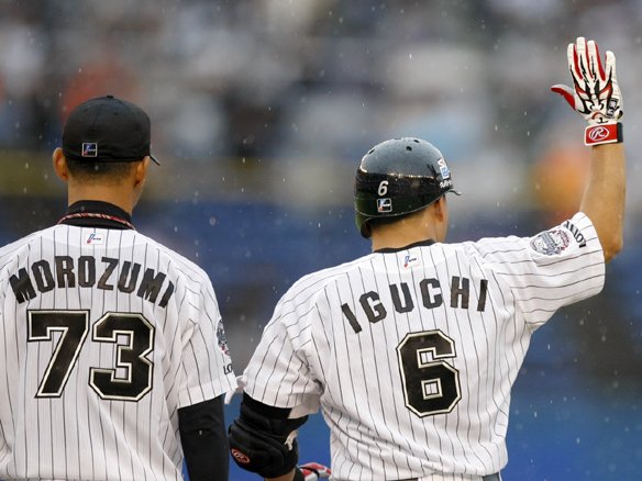 2死から昨日ホームランを打った3番・大松がヒットで出塁しましたが、4番・井口が倒れて、初回は先制ならず。上々の立ち上がりを見せた小野のピッチングで流れを引き寄せる!  |