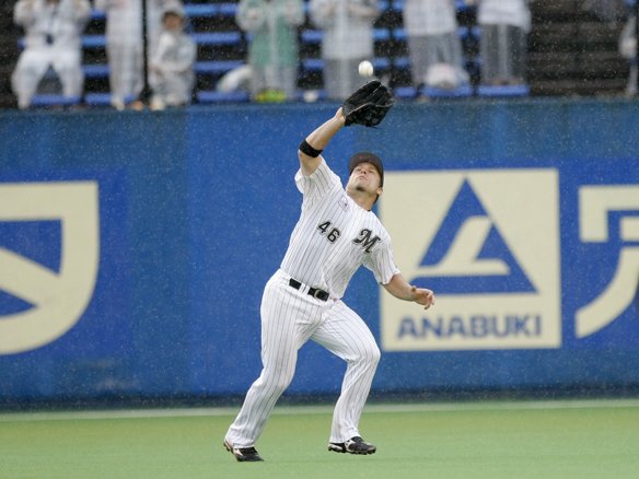 6番 糸井 一邪飛 2-2から変化球で打ち取った! ファースト・福浦がファールゾーンで落下点に入りキャッチ。  |