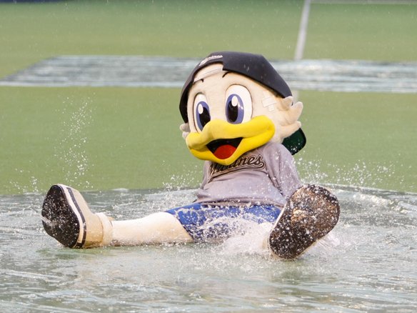 投手 スウィーニー 雨の影響でマウンドがぬかるんでいるため、ここで一度マウンドの整備を行います。  |
