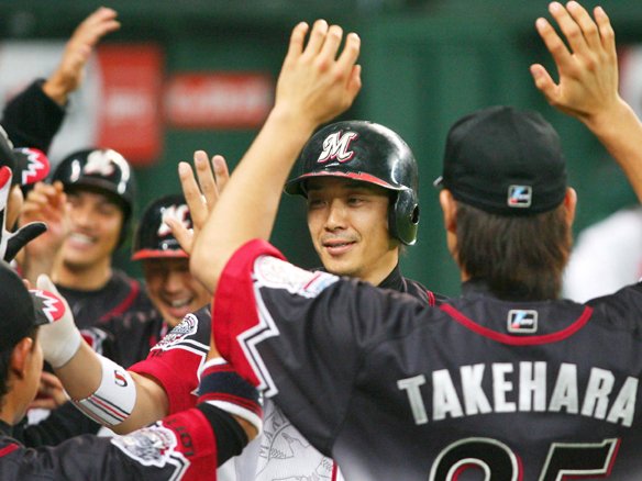 竹原のフォアボール、里崎の進塁打、今江のセンター前ヒット、西岡のフォアボールで1死満塁とチャンスメイクすると、代打・福浦が犠牲フライで3対0!! 効率の良い攻撃で追加点を奪いました!  |