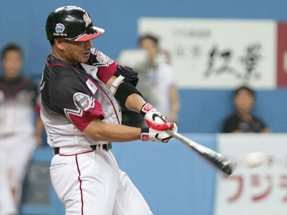 6番 里崎 遊ゴ 1-2からの4球目、アウトコース高めのチェンジアップを強く叩いた打球は、ショート・大引の正面へ。目で牽制された2塁ランナー・早坂が2塁に戻された後、ゆっくりと1塁に送球されてしまった・・・。 |