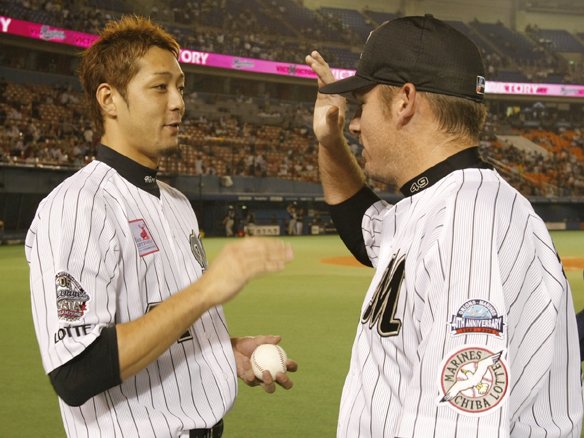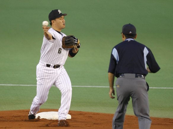 投手 金無英 2番 今江 右中二 1-0からの2球目、アウトコース低めに落ちるフォークボールに食らいついて右中間に弾き返した打球は、前進していたセンター・長谷川とライト・多村が背走する先で弾んでフェンスに到達!! 2塁ランナー・早川がゆっくりとホームイン!!7対3。 打った今江は2塁へ!! ![]() 7