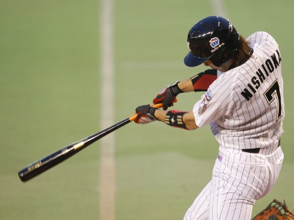 1番 西岡 左安 2-3からの6球目、アウトコース高めのストレートを逆らわずに叩いた鋭い打球は三遊間の真ん中に飛び、レフト・オーティズの前に抜けていった!!  |