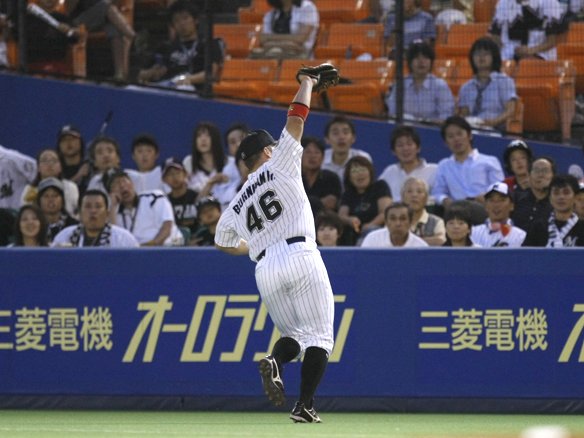 6番 里崎 右犠飛 0-2からの3球目、アウトコース寄りに甘く入ったスライダーをやや遅れ気味に振り抜いた打球は、グングン伸びてウォーニングゾーンに入ったところでライト・多村に追いつかれてしまった。 しかし、3塁ランナー・井口をタッチアップからホームに迎え入れるには飛距離は十分!!6対3。 ![]() 6