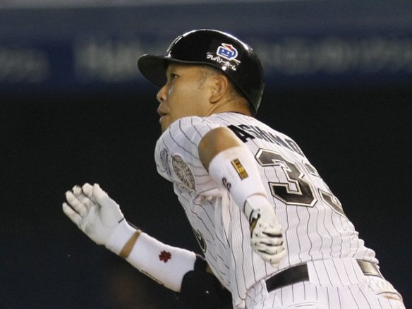 5番 サブロー 四球 2-3からの6球目、インコース低めに外れるスライダーがワンバウンドして、キャッチャー・田上が捕球できず、バックネットに転がった!! それを見た井口は2塁を回って一気に3塁へ!! 記録はフォアボールとピッチャー・三瀬のワイルドピッチ。  |