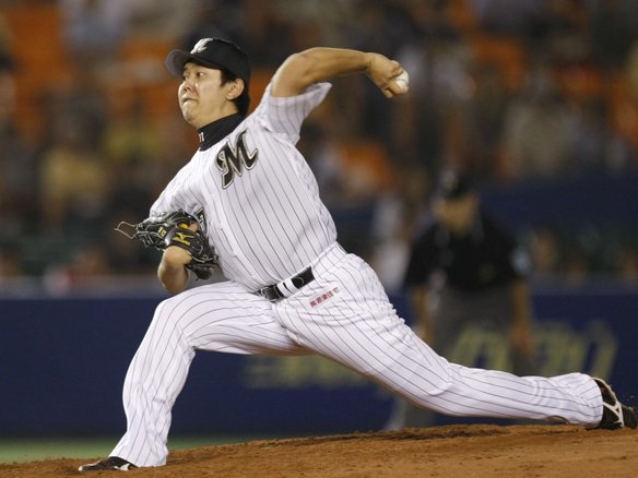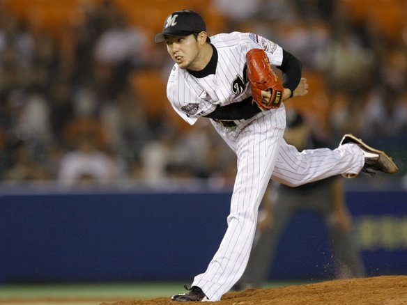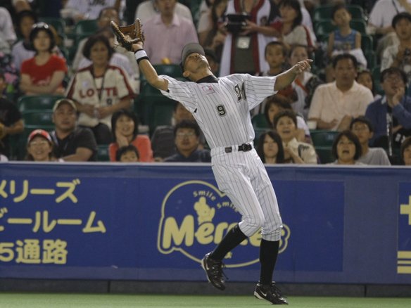 7番 二岡 三ゴ失 0-1からの2球目、インコース高めのストレートを鋭く引っぱられた打球は、サード・ランビンが体で止めて前に落とし、拾い上げて1塁に送球するも、高くそれて飛び上がったファースト・福浦のミットを弾いてしまった・・・。 3塁ランナー・糸井に続いて2塁ランナー・小谷野が同点のホームイン・・・。6対6。 記録はランビンのエラー。打った二岡は2塁へ・・・。  |