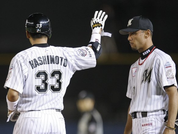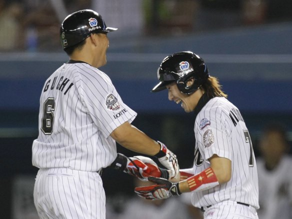 ランビンの2ベースヒットを足掛かりに、西岡のタイムリーヒットと井口の6月30日のライオンズ戦以来となる一発で3点を追加しました!!  |
