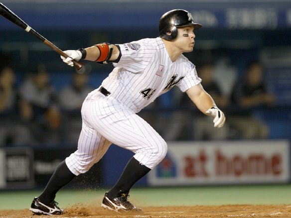 3番 サブロー 遊ゴ 1-0からの2球目、アウトコース高めのスライダーをピッチャー返しした打球は、ピッチャー・スウィーニーの脇を抜けたが、回り込んだショート・金子誠に追いつかれ、1塁に送球されてしまった・・・。  |
