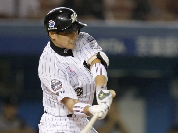 3番 サブロー 中安 1-2からの4球目、アウトコース低めのスライダーにバットを折られながらも弾き返した打球は、センター・糸井の前で弾んだ!!  |