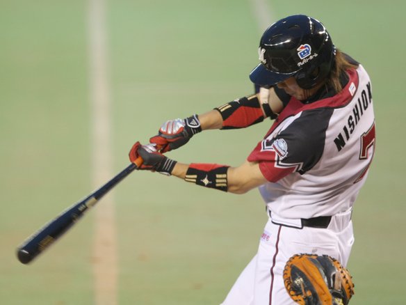 1番 西岡 中越二 1-1から高めのストレートをフルスイング! 打球はグングン伸び、フェンスを直撃した! センター・鉄平は内野に返すのみ。西岡は2塁へ。 |