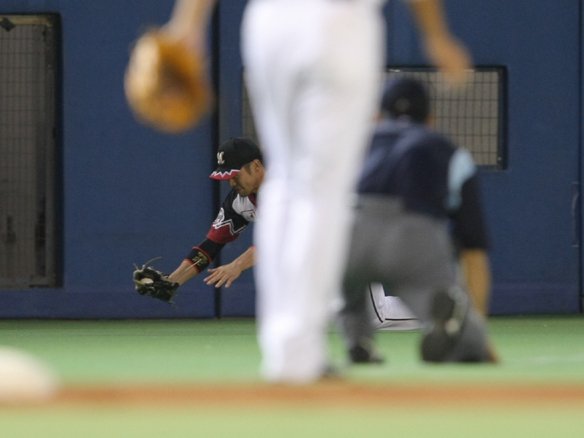 4番 大松 三邪飛 2-1から7球目の真ん中低めのストレートにバットをへし折られ、サード・草野がバックしてレフト線付近のファールゾーンでキャッチ。 |