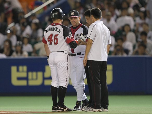 8番 バーナムJr. 死球 2-1から5球目のインコースのストレートに打ちにいった右手が当たってしまった。バーナムJr.は痛みを何とか堪えて1塁に出塁した。 |
