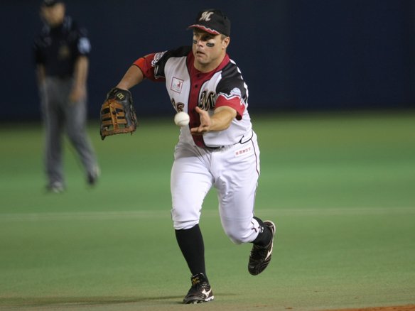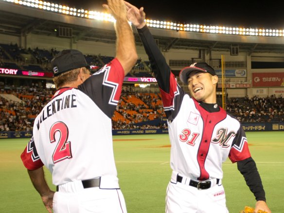 7番 里崎 右翼安 2-1から4球目のアウトコースのストレートをうまく右方向へ弾き返した! ファースト・セギノールの頭上を越えていく強い打球はフェンスまで到達したが、ライト・リンデンが素早く打球を処理して内野に返球したため、里崎は2塁へ進塁できなかった。 |
