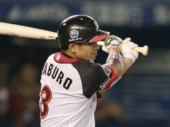 3番 サブロー 左安 初球の真ん中のフォークを引っ張り、三遊間を破っていった! 2塁ランナーの井口は3塁ストップ。 |