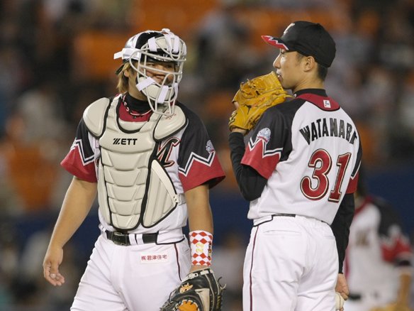 投手 渡辺俊 渡辺俊は先頭の代打・中村真にフォアボール、鉄平にヒットを許して無死1,2塁のピンチを招きましたが、山崎武をダブルプレーに抑えるなどして無失点に抑えました。渡辺俊は今季初の完投勝利で5月6日のファイターズ戦以来の今季2勝目を挙げました! マリーンズはこれで連敗を止め、バファローズに並び5位タイに浮上。苦しかった7月を勝利で締めくくり、明日の月初めの試合に勝って8月攻勢を仕掛けていきたいところです! |
