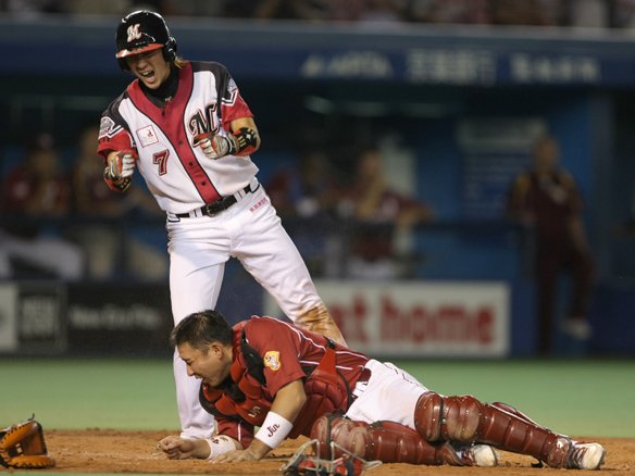 2番 井口 中安 2-0から5球目の高めのストレートを強引にピッチャー方向に打ち返し、打球は二遊間を破っていった! 2塁ランナーの西岡は加速して3塁ベースを回った! センター・鉄平が直接ホームに返すも、西岡がキャッチャー・中谷をはじき飛ばし、ホームインして2対1! 送球間に打った井口は2塁進塁! ![]() 2