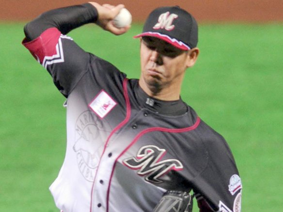 投手 清水直 毎回ランナーを許し、我慢のピッチングを続けてきた清水直でしたが、小久保に同点の2ランを浴びて、試合は振り出しに戻りました。前の打席でホームランを放ったサブローからチャンスを作り、再び試合の流れをマリーンズに引き寄せたい!  |