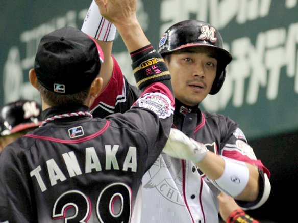 7番 福浦 右安 フルカウントからアウトコースのスライダーをうまく合わせ、ライト線に運んだ。ライト・村松はフェンスに到達する前に追いついたがファンブルし、打った福浦はスキを突いて2塁に進みヘッドスライディング。記録は、ヒットとライト・村松のエラー。  |