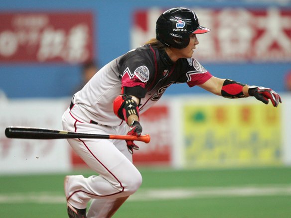 投手 金子 3番 サブロー 中越二 1-2から高めのストレートをセンター方向に弾き返した! 打球は伸びていき、フェンス直撃。センター・坂口がバウンド処理を誤ったので、サブローは悠々と2塁に到達!  |