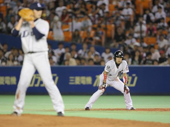銀仁朗に2ベースヒットを許しましたが、キャッチャー・里崎が2塁牽制で銀仁朗を刺し、ピンチをしのぎました。さあラッキー7、女房役・里崎が好投を続ける小林宏を援護したい!  |