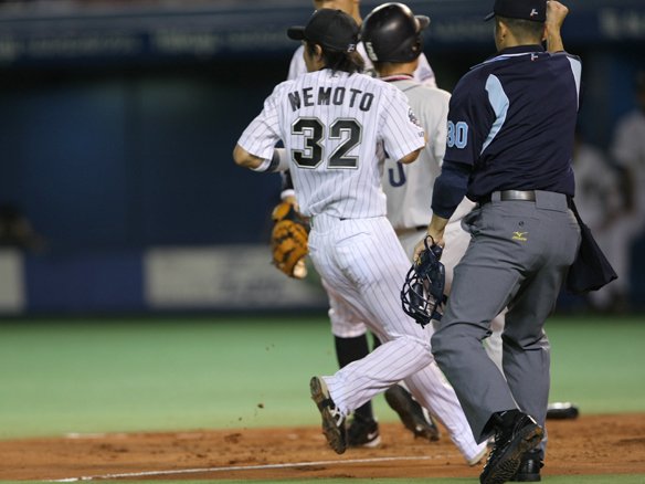 8番 炭谷 三ゴ フルカウントからの6球目、低めのスライダーを引っ張った打球は、サード・根元が正面で捕球。3塁ランナー・石井義を三本間で挟み、根元がタッチした。 1塁ランナー・G.G.佐藤は2塁でストップ。  |
