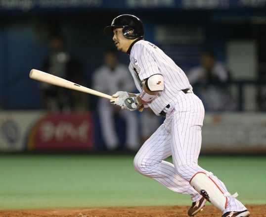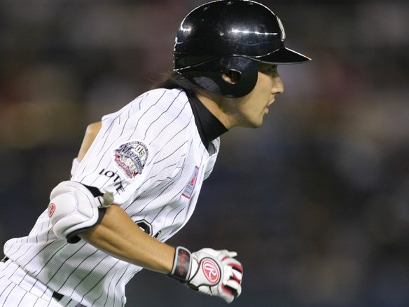 投手 涌井 3番 サブロー 左翼二 1-3からアウトコースのスライダーを強振した打球は、サード・中村の頭を越えてレフト線を破った! 打ったサブローは悠々と2塁に進んだ。  |