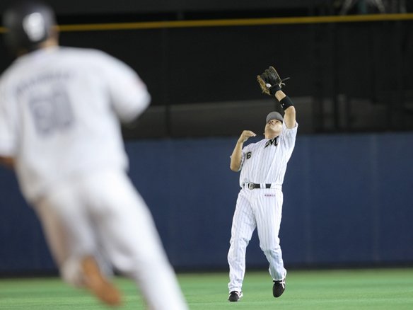 7番 G.G.佐藤 中飛 フルカウントから高めのストレートを振り抜いた打球は、鋭い当たりとなったがセンター・サブローが定位置で捕球した。  |