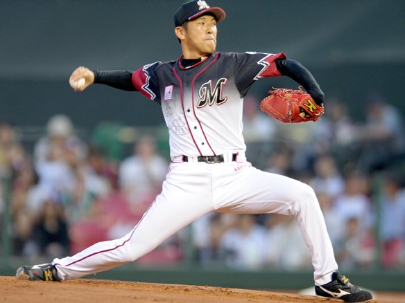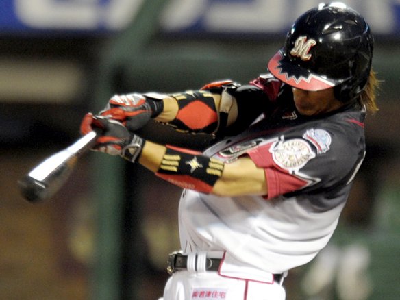 6番 里崎 死球 2-2からの5球目、インコース高めに大きく外れるシンカーが里崎の左ひじを直撃。里崎はそのまま1塁に歩いた。  |