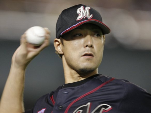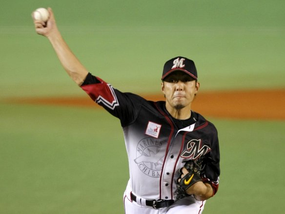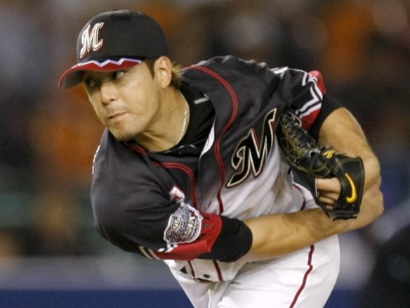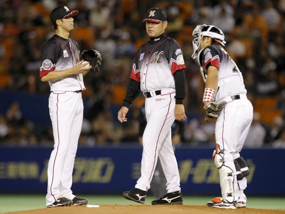 先頭の里崎がヒットで出塁しましたが、西岡のピッチャー返しの打球が不運にも併殺打になってしまい、結局3人で攻撃を終えました。まずは守備からリズムを作って、試合の流れをマリーンズにたぐり寄せたい!  |