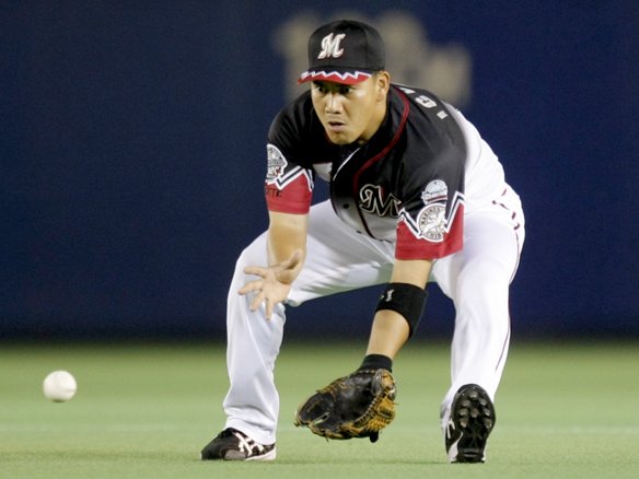 1番 西岡 一ゴ 1-0からアウトコース高めのシンカーをたたいた打球は、平凡なゴロとなってファースト・稲田が捕球。自らベースを踏んだ。その間に2塁ランナー・里崎は3塁に進んだ。  |