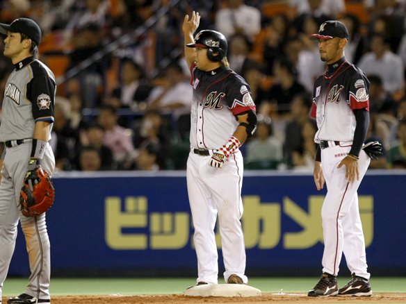 2番 サブロー 左翼二 フルカウントからの8球目、真ん中のシンカーを引っ張り、打球はレフト線を破ってフェンスに到達した!! 3塁ランナー・里崎が還り、マリーンズが1点を返した。1対3! 打ったサブローは2塁に進んだ! ![]() 1