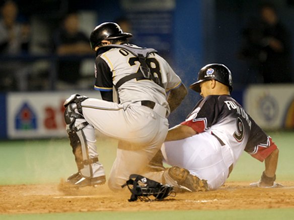 8番 里崎 左二 フルカウントからインコースのストレートに詰まったのが幸いして、フラフラっと上がった打球は懸命に前進するレフト・村田の前に落ち、勢い余って村田はボールを後ろに逸らした。ボールが転々とする間に里崎はスライディングして2塁を陥れた!  |