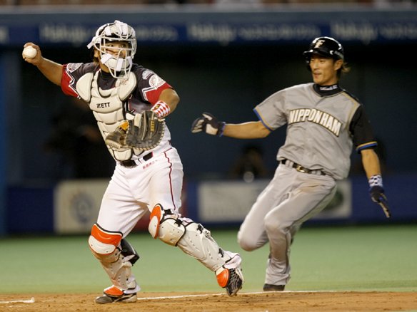 投手 スウィーニー 8番 里崎 右安 フルカウントからインコースのチェンジアップにうまく合わせた打球は、フラフラッと上がってバックするセカンド・田中賢の頭上を越えてライト前に落ちた!  |