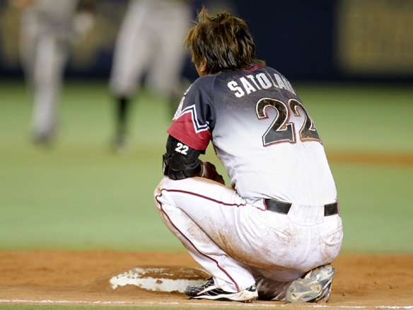 9番 金子誠 左翼二 2-1からアウトコース低めに落ちるスライダーを引っ張られ、打球はレフト線を破られた・・・。3塁ランナー・スレッジ、2塁ランナー・小谷野が相次いでホームイン。金子誠のタイムリーで先制を許し0対2・・・。 1塁ランナー・糸井は3塁へ、打った金子誠は2塁に進んだ。 ![]() 0