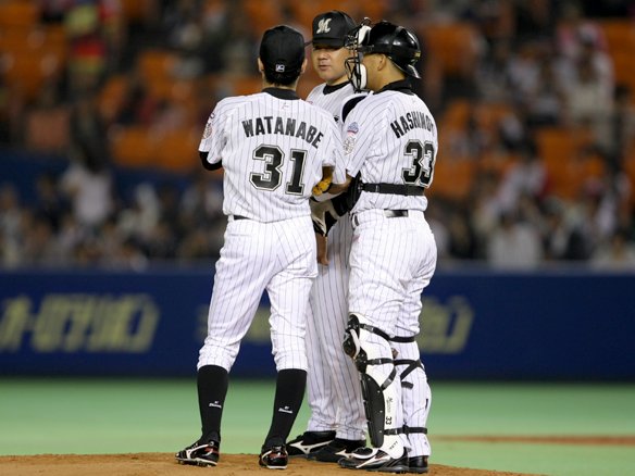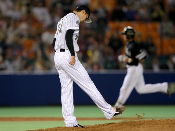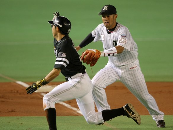 3番 オーティズ 二ゴ 初球、アウトコース寄り高めのシンカーを引っ掛けさせた打球は、前進守備のセカンド・井口の正面へ。井口はすばやくキャッチャー・橋本将に送球して、橋本将は飛び出していた3塁ランナー・川崎を3塁へ追い込み、最後はサード・今江に送球して川崎はタッチアウト!! 打ったオーティズが1塁に残った。  |