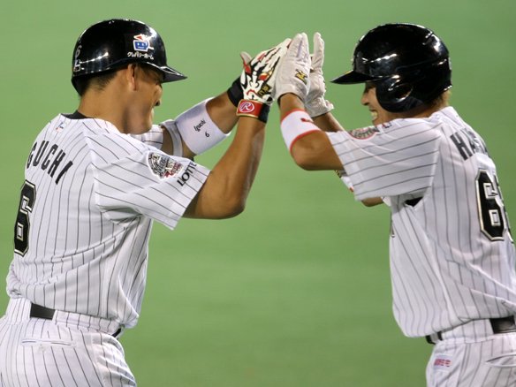 17号2ランを放った井口は早坂と笑顔でハイタッチを交わす