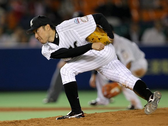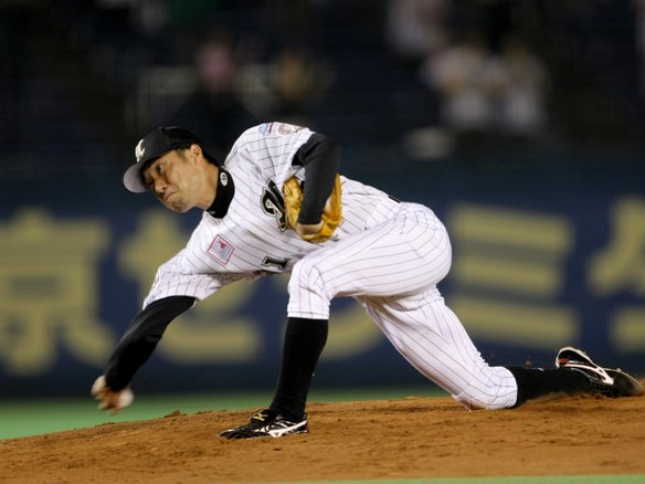 投手 渡辺俊 2点をもらった直後、先頭・松中を打ち取った打球が風に押されて2ベースヒットになり、ピンチを向かえた渡辺俊でしたが、緩急自在の投球でここも無失点。ホークスの反撃を見事に断ち切りました!!  |