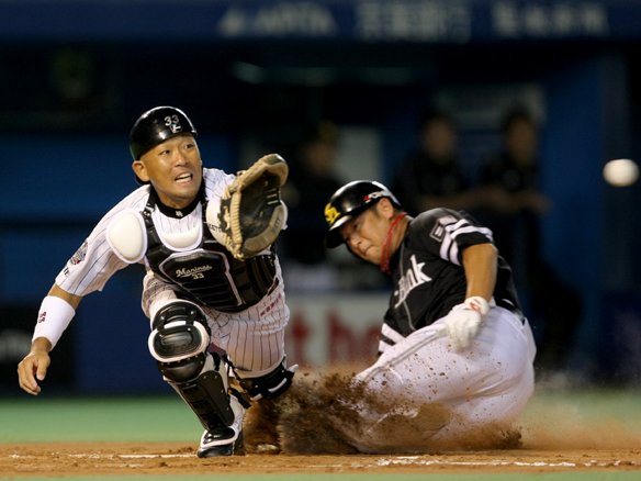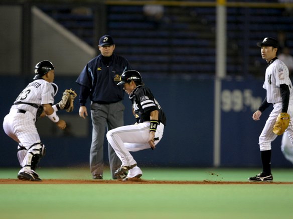 6番 多村 左安 2-1からの4球目、アウトコース低めのスライダーを拾われて弾き返された打球は、レフト・ベニーの前で弾んでしまった。 3塁ランナー・オーティズがゆっくりとホームイン。 さらに2塁ランナー・小久保も3塁を回ってバックホームとの競争になったが、キャッチャー・橋本将が送球を捕球しきれずに逸らしてしまった・・・。4対5。 その間に打った多村は2塁へ・・・。 ![]() 4