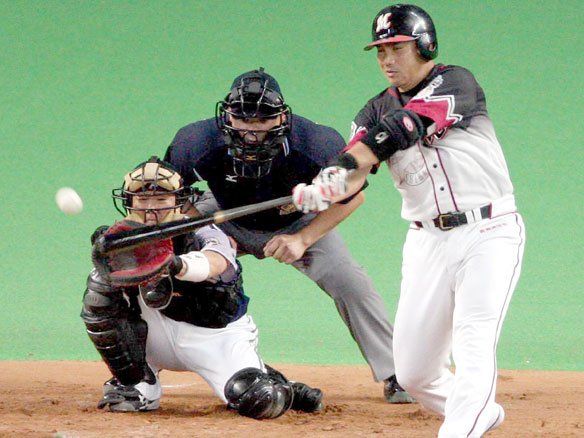 1番 西岡 右中二 初球、真ん中高めに抜けたフォークボールを鋭く弾き返した打球は、右中間の真ん中を破ってフェンスに到達!! 2塁ランナー・里崎はゆっくりとホームイン!!1対2。 打った西岡は2塁へ!! ![]() 2
