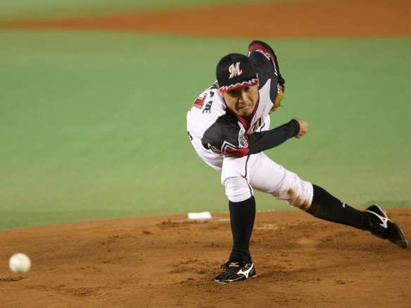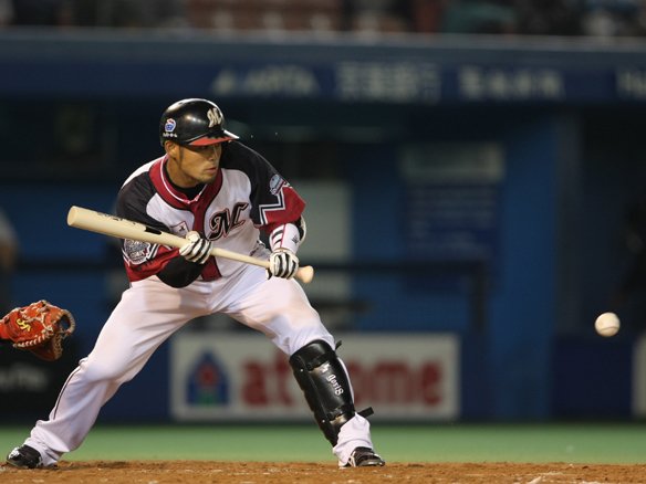 8番 今江 一犠 初球、アウトコースのスライダーをバントで1塁側に転がした。打球はピッチャー・涌井とファースト・石井義が譲り合うが、最後は石井義が捕球して1塁に送球した。2塁ランナー・里崎は3塁へ、1塁ランナー・福浦は2塁にそれぞれ進んだ。送りバント成功。 |