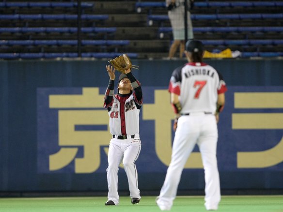 今日1軍登録のレフト・角中が4番・中村の打球をしっかりキャッチ!
